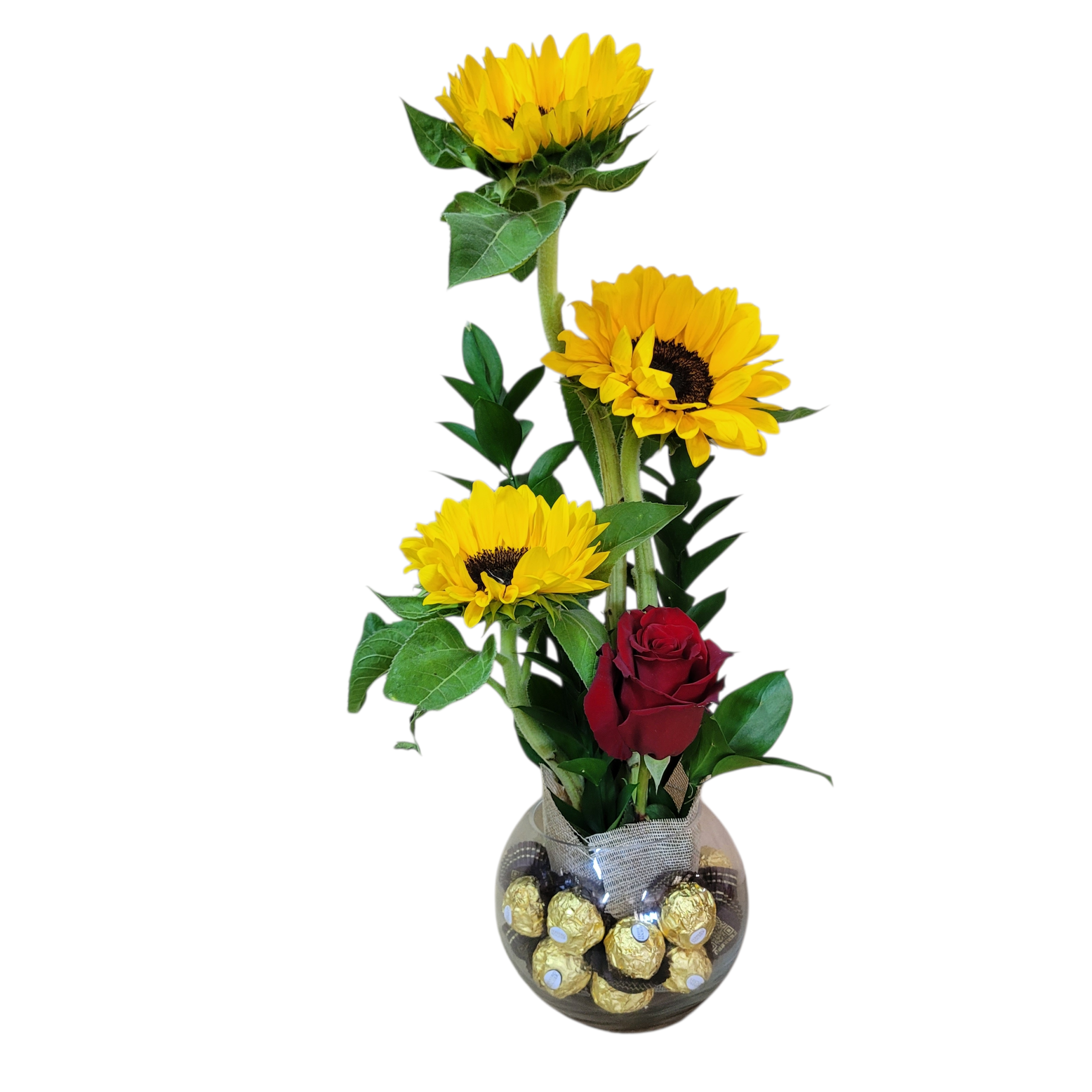 hermoso arreglo 4 flores + chocolates