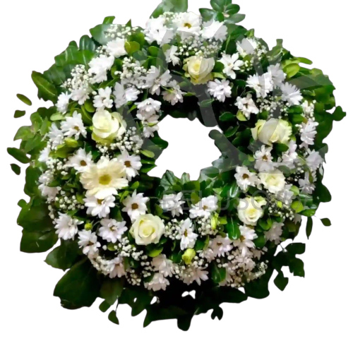 CORONA CON MARGARITAS Y ROSAS BLANCAS