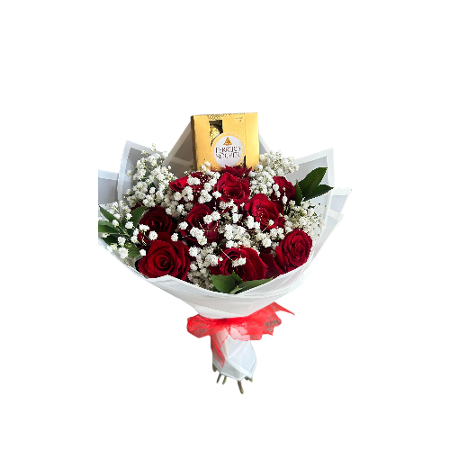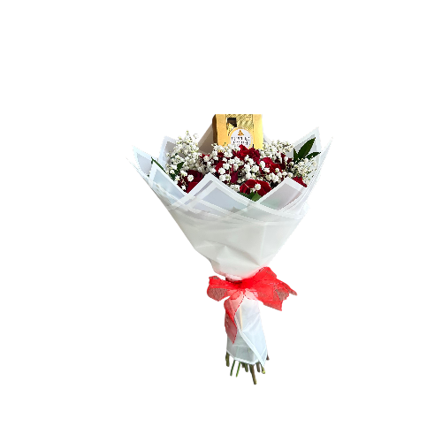 12 hermosas rosas + chocolate de 4 bombones ferreros