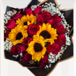 hermoso ramo de mano con 18 rosas y 4 girasoles