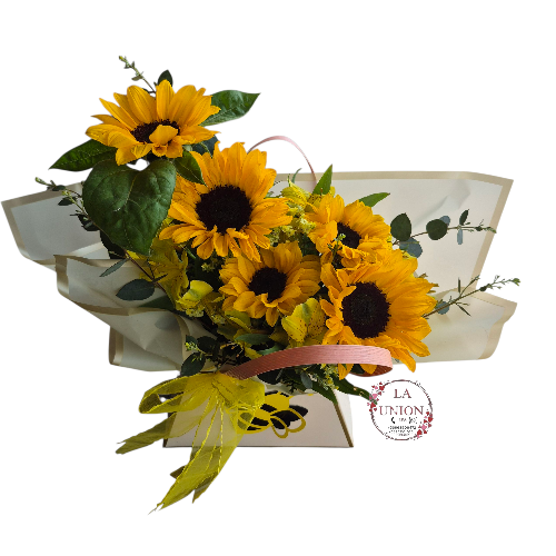 hermosa caja con 5 girasoles + 5 varas de hastromelias +follaje verde y blanco