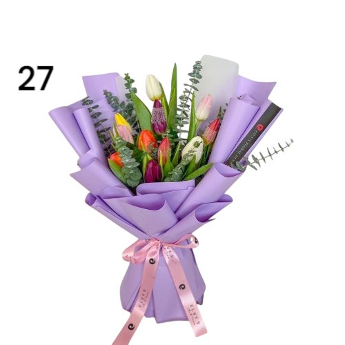 Hermoso ramo de mano con 10 tulipanes surtidos + follaje de eucalitus