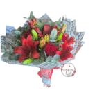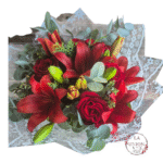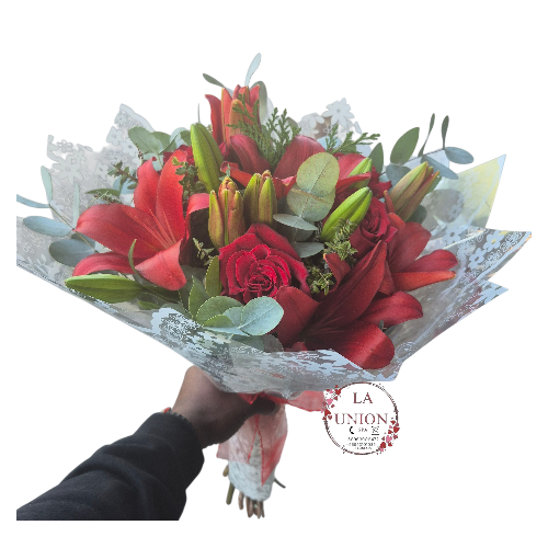 hermoso ramo con 8 tallos de flores 4 rosas y 4 lilium con follaje verde y blanco