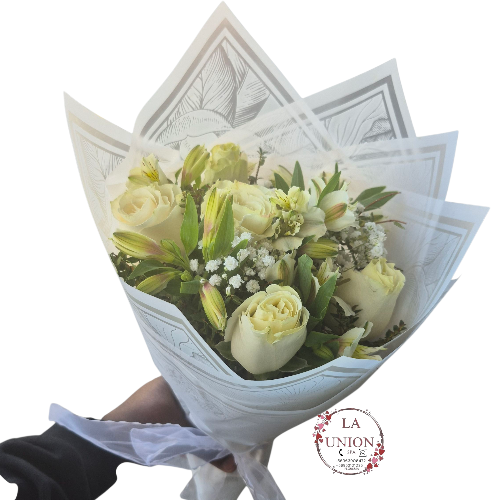 hermosas 5 rosas y10 tallos de astromelias blancas
